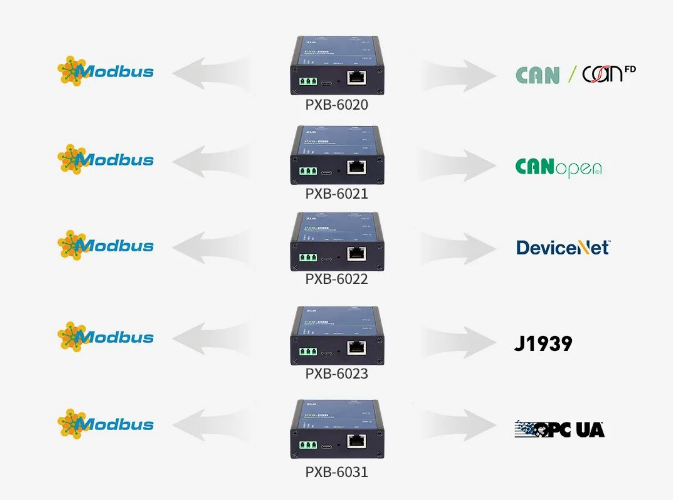 PXB-6021可实现Modbus与CANopen协议转换,PXB-6022可实现Modbus与DeviceNet协议转换,
