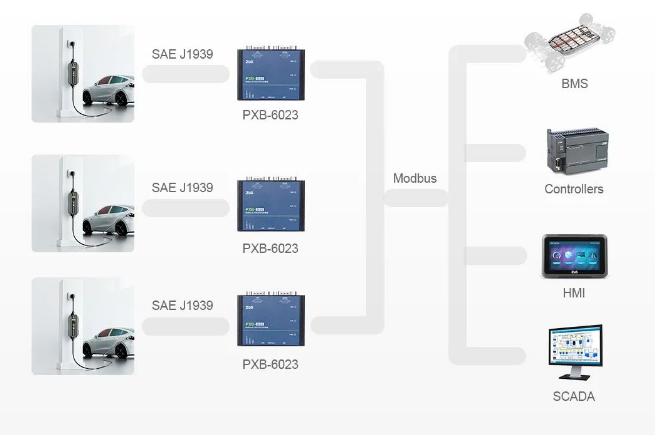 PXB-6023支持Modbus转J1939协议,能将原本使用串行总线进行通讯的设备快速连接到CAN
